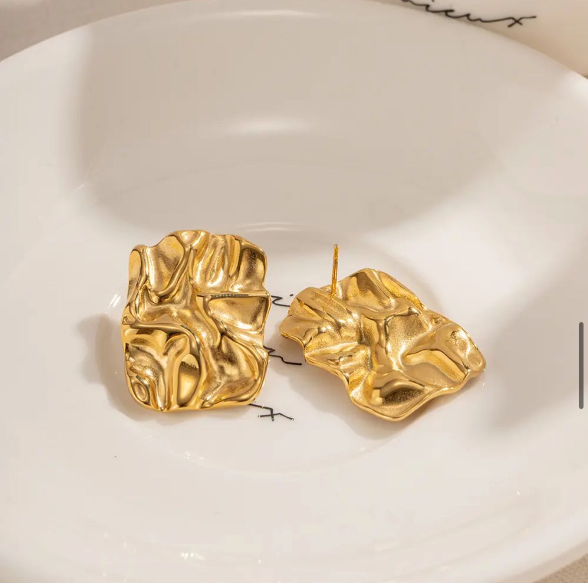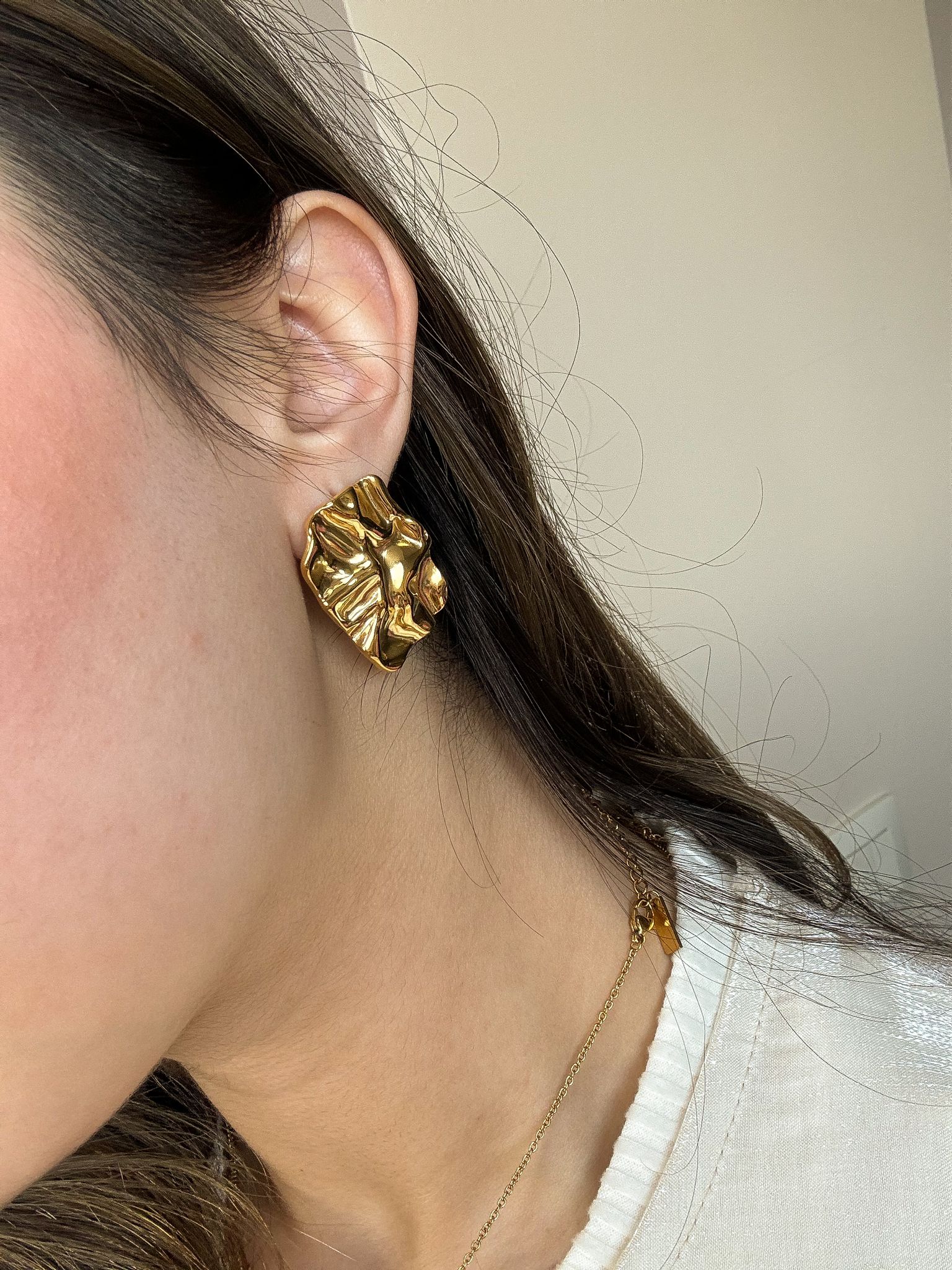 Crafted with meticulous attention to detail, these earrings boast a luxurious 18k gold plating, adding a rich, radiant finish that enhances any outfit. Their bold, sculptural form commands attention, making them ideal for both sophisticated daywear and glamorous evening events.